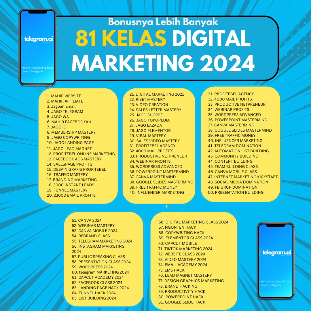 Nah ini yang penting, jaman sekarang Ilmu Digital Marketing Lagi banya di cari, eh ini malah dikasih gratis, ada 81 Kelas pula. Silahkan nanti bisa dipelajari sendiri